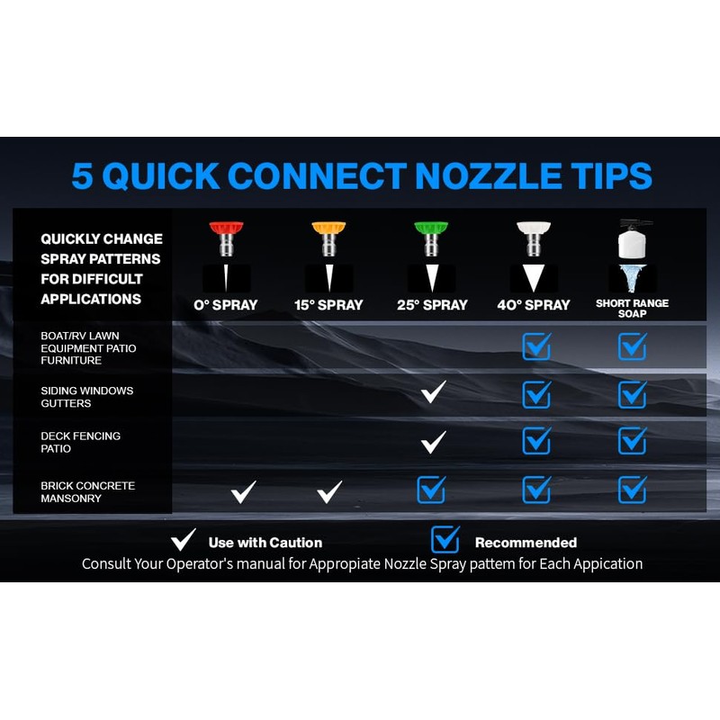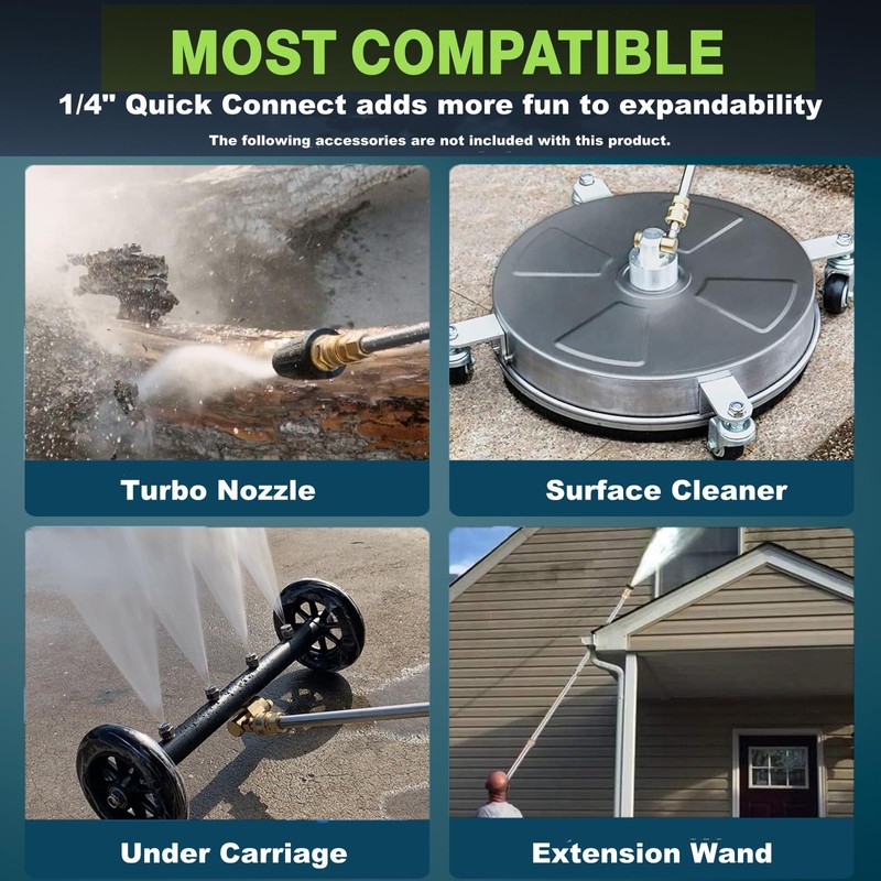 - Upgraded Spray Gun: The pressure washer spray gun has a 1/4" metal connection suitable for various extensions like surface cleaners and turbos. The electric power washers 5000 psi includes a storage box for four degrees of nozzles (0°, 15°, 25°, 40°), which can be used as you like.