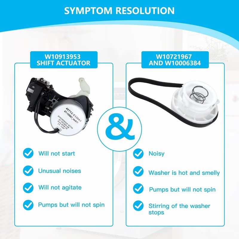 - Compatibility: W10913953 washer shift actuator/ W10721967 washer pulley clutch kit & W10006384 washer drive belt compatible for Whirlpool/ May-tag/ Ken-more/ Ama-na/ Crosley/ other brands. Replacing them can help improve the efficiency of your washing machine and make it last longer