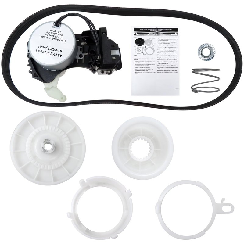 The W10721967 washer pulley clutch kit includes drive pulley, cam replacement kit and W10006384 washer drive belt (21 inch)
