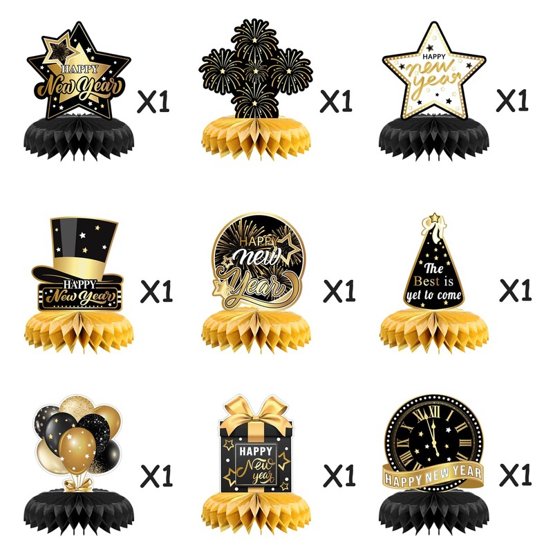 - đăMultiple StylesăYou will receive 9 New Year's Eve Honeycomb Centerpieces with 9 different designs Shiny New Year's Honeycomb Centerpieces, including balloons, fireworks, gifts, hats, clock countdown, happy new year 2025 logo decoration, etc. , the black and gold design is perfect for happy new year table decoration.
