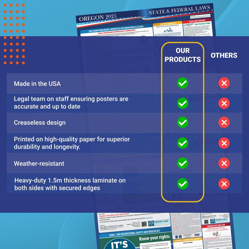 - ✓ 2025 Oregon State and Federal Labor Law Poster ensures compliance with updated Oregon labor laws, including the updated Minimum Wage, revised Overtime Rules, Captive Audiences, revised Paid Leave and Family Leave, updated Equal Pay, Sexual Harrassment and Domestic Violence Protections, aligning with OSHA requirements.