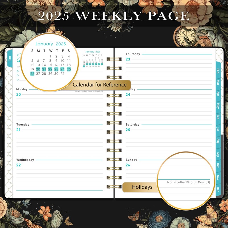 - 🦋 2025 WEEKLY OVERVIEW - Each weekly spread has lots of space for jotting down your detailed daily schedule, like appointments, events and deadlines, etc. The holidays marked remind you of important dates, tracking all day with a clear weekly view.