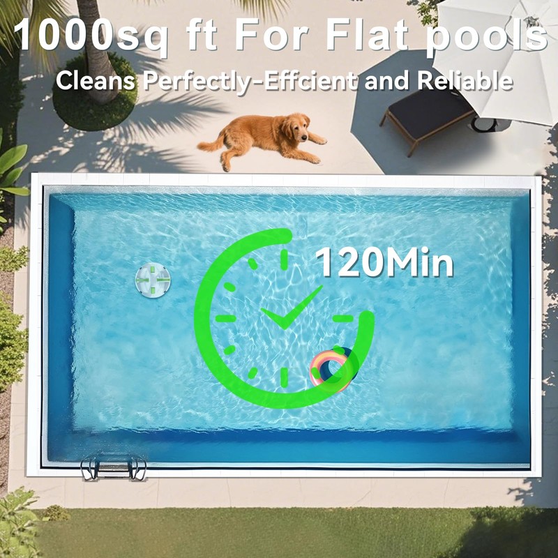 - 💦Long Runtime & Fast Charging: The upgraded cordless robotic pool cleaner's battery provides an astonishing 120 minutes of continuous cleaning, covering pools up to 1000 sq. ft. The pool vacuum only takes 3.5 - 4 hours to fully charge, allowing you to quickly get it back to work for regular pool maintenance, saving both time and energy.