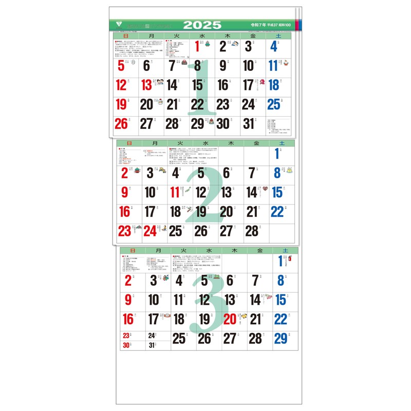トーダン 2025年 カレンダー 壁掛け カラー3ヶ月文字S(上から順 / ミシン目) 52.3 x 24.2cm TD-981