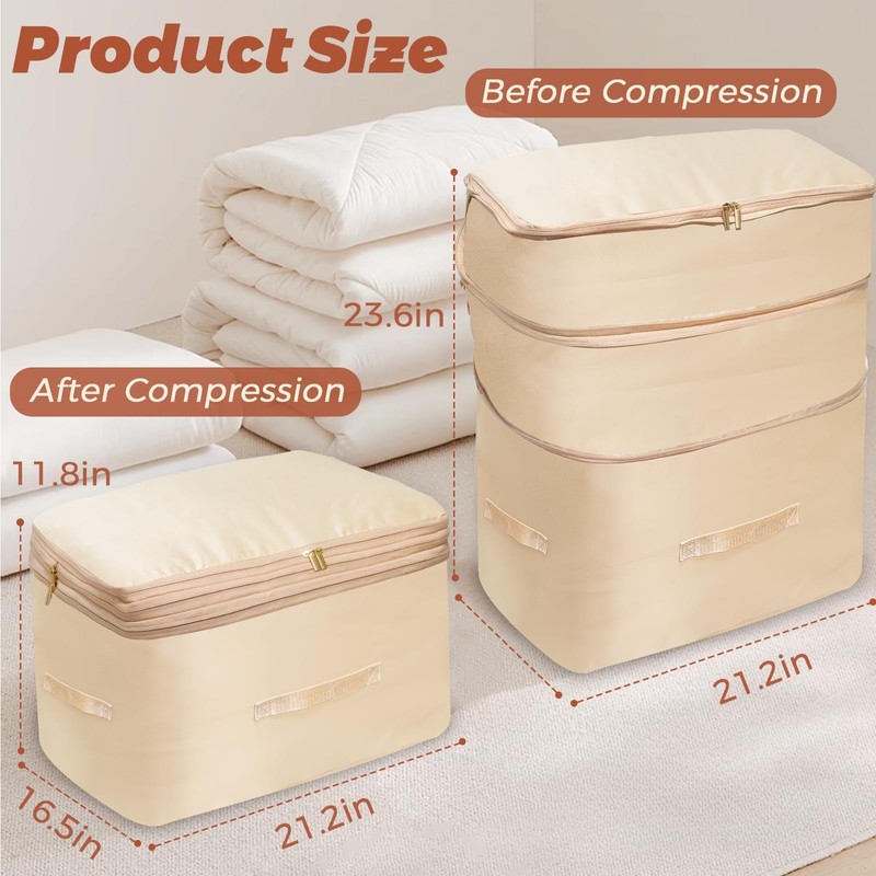 - 【EXTRA LARGE CAPACITY】- With a size of 21.5" X 16.5" X 11.8/23.6", the comforters storage bag features a metal air vent, allowing you to compress without damaging your comforter. Despite its large capacity, it remains compact, making it perfect for storing and organizing winter blankets, comforters, oversized quilts, sweaters, duvets, and sheets.