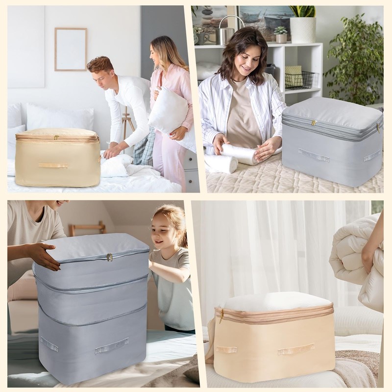 - 【PREMIUM MATERIALS】- Featuring a metal dual zipper design for smooth opening and durability, even when fully loaded. Made from durable, high-quality, 40% thicker cotton fabric, our closet organizer bag is resistant to pilling, environmentally friendly, odorless, and skin-friendly. This smooth fabric protects your comforter and clothes from wrinkles and stains, ensuring long-lasting, sturdy, and wear-resistant use.