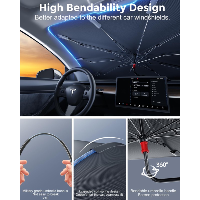 - [Patented Design] - This umbrella windshield sun shade has 42 patents & certs. Weektic umbrella windshield sun shade designed by the newest ice Nano materials and cold reflector. Adopted high-density glass fabric combined with a polyester fiber cold reflective cooling coating, which effectively blocks harmful sunlight and UV rays.
