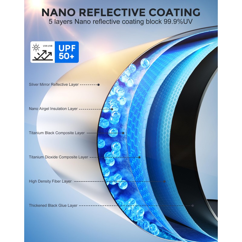- [UPF50+ Ice Crystal Nano Technology] — Innovative double-layer hollow layer cold reflection technology, with over 5000 cold nano molecular crystal tubes on the fiber surface. Make it have super strong reflection and heat dissipation performance. It always keep your car cooler and protect your car from fading and cracking.