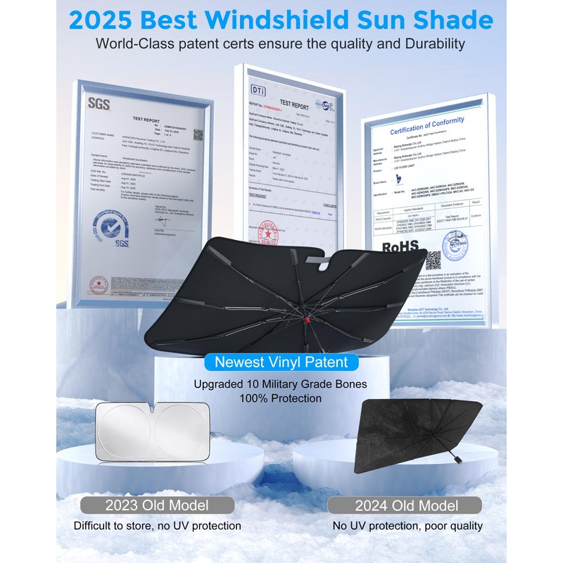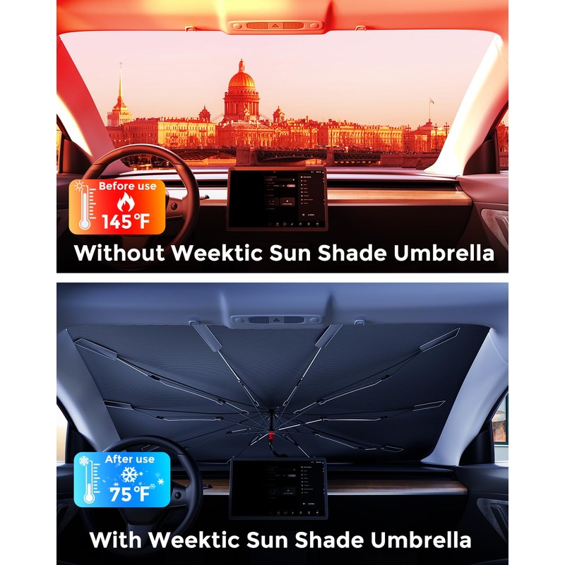 - [Patented Design] - This umbrella windshield sun shade has 42 patents & certs. Weektic umbrella windshield sun shade designed by the newest ice Nano materials and cold reflector. Adopted high-density glass fabric combined with a polyester fiber cold reflective cooling coating, which effectively blocks harmful sunlight and UV rays.
