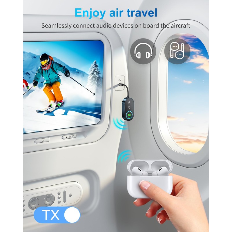 - Dual Device Pairing Bluetooth Transmitter: The airplane Bluetooth adapter supports connecting two Bluetooth devices at the same time, allowing you to enjoy movies and music with your friends or family, with automatic connection memory function, after successfully connecting once, the airplane Bluetooth adapter will automatically connect to your phone when you turn on Bluetooth again.