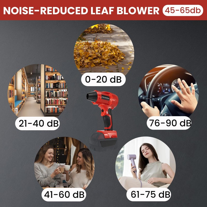 - Performance: The cordless leaf blower is built-in a powerful brushless motor, is surprisingly quiet for how strong it is (Lower than 65db, similar to the sound of a hair dryer ), no worry about disturbing the neighbors. Also, the variable speed control of our air blower gunf allows to easily adjust the power for the task at hand whether dealing with a few dry leaves or needing to clear heavier debris.