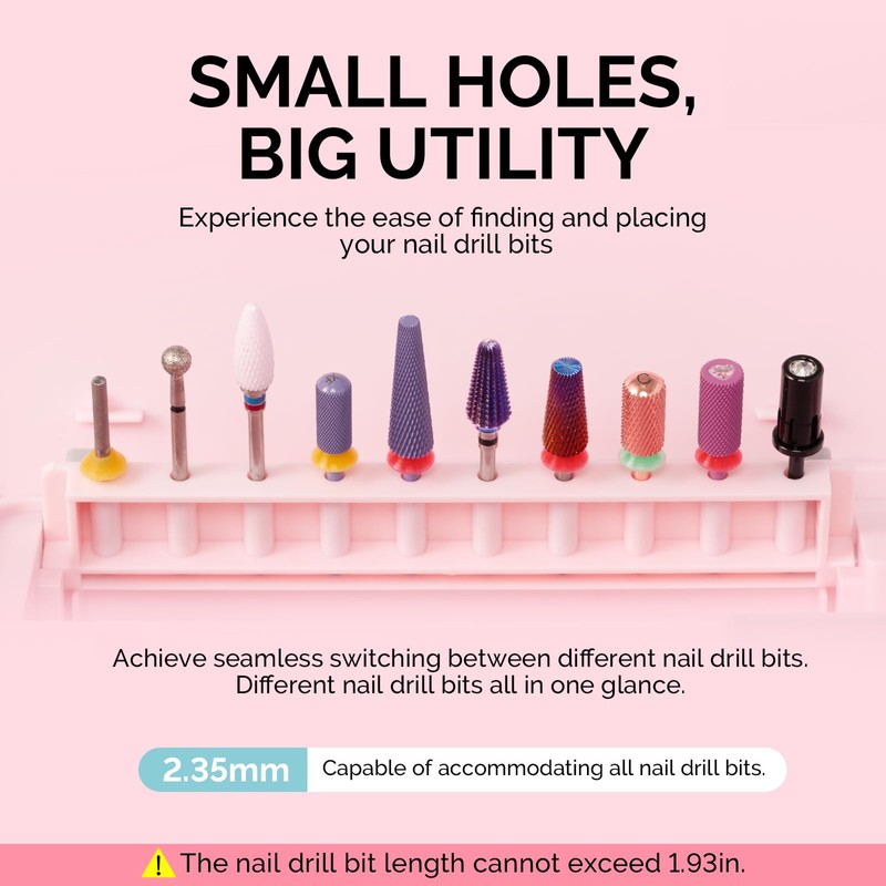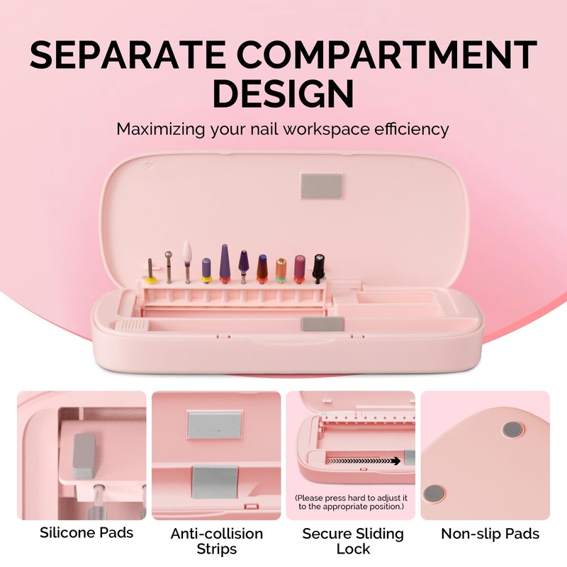 - [Separate Compartment Design]: Make nail accessories look tidy and orderly. It allows you to find the nail tools you need easily and quickly, improving efficiency to enjoy a better nail art experience. No mess on your nail art table and no mess on your travel bag. The fixed-position design prevents the nail drill bit from scratching other tools. Keep everything organized and stable, avoiding the damage caused by collision.
