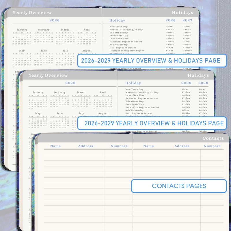 - FEATURES – 3.8" × 6.3" Planning Pages | Leather-Like Hardcover | Pen Holder | Inner pocket | Yearly Overview | Holidays | 61 lined Note Pages | Contacts | Elastic Closure | Highlighted Federal Holidays | Lay Flat | 2 Page Divider|