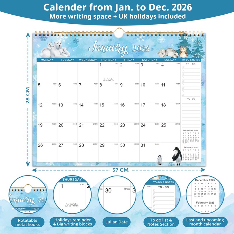2026 Calendar - Calendar 2026 Month to View from Jan. - Dec. 2026, 2026 CALENDAR UK, 37 x 29 cm, Julian Dates, Holidays, Large blocks