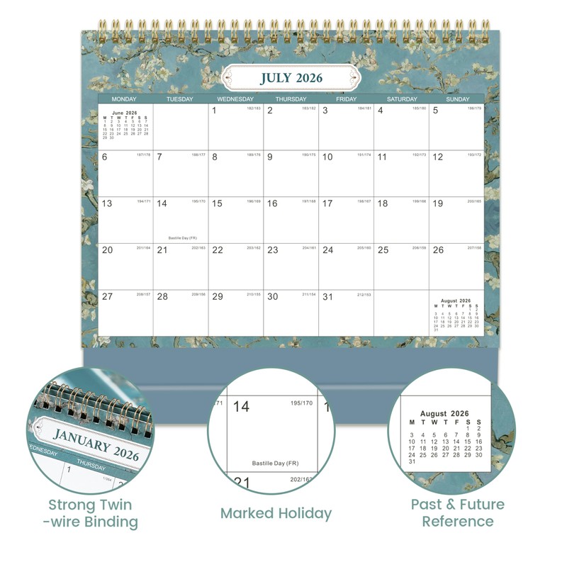 - Desk calendar features "Almond Blossom", paired with MEMORANDA Page for every month and clear monthly spreads showing 6 months.