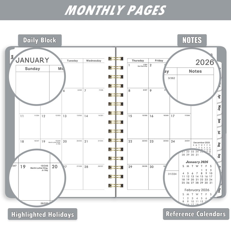 - Monthly Layout - Every month in this 2026 planner spans two full pages, providing generous space for long-term planning. There are ruled writing blocks (1.8" x 1.91") for you to write your goals, deadlines, and reminders. Besides, the 3-month reference calendars help you keep long-term plans in sight.
