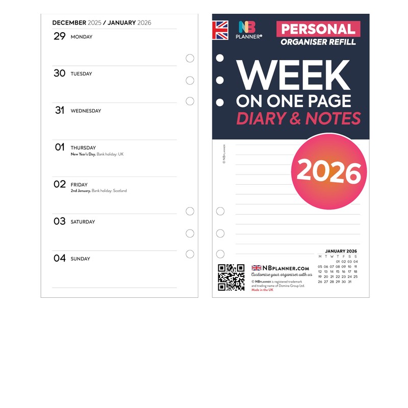 2026 Week on one page diary & lined notes organiser refill white | UK holidays | Filofax PERSONAL size COMPATIBLE (2026 Week on one page)