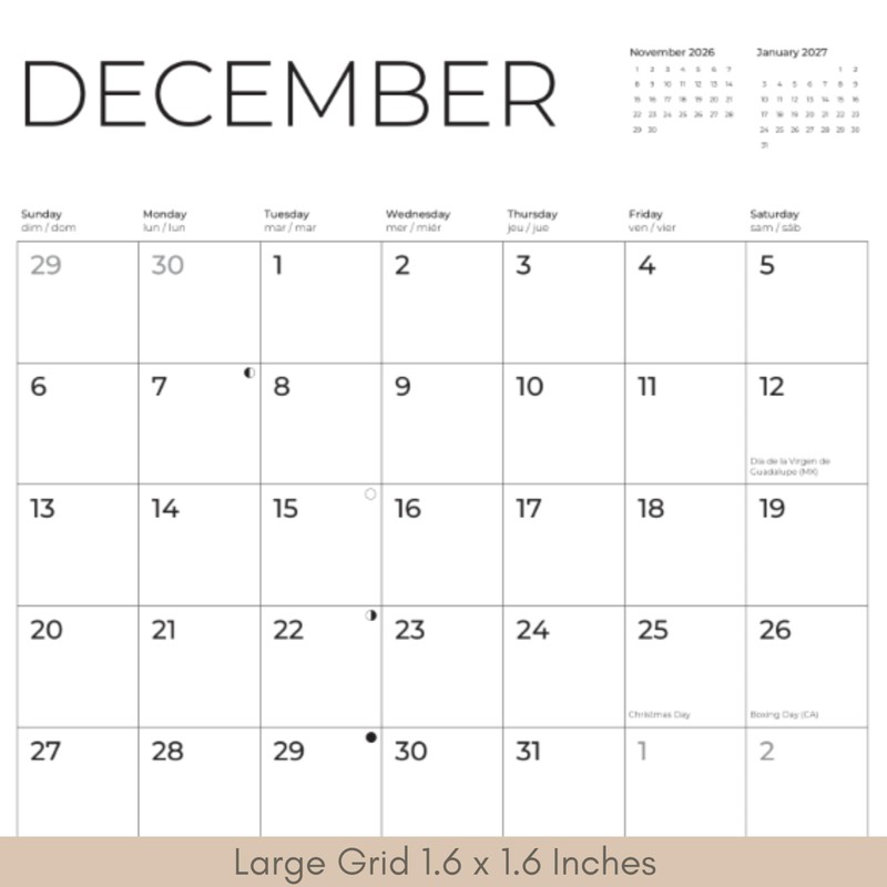 - Furry friend calendar includes all major holidays for the USA, Canada, and Mexico, along with moon phases. Each month displays a spacious 1.6" x 1.6" block grid for easy planning, with prior and upcoming months conveniently referenced at a glance. Also features a 6-month overview for July 2025 through December 2025 for future planning.