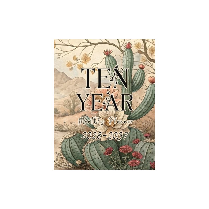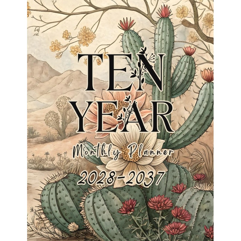 2028-2037 Ten Year Monthly Planner: Floral 10 Year Calendar Organizer Two Pages Per Month From January 2028 To December 2037 with Holidays Cactus Lover