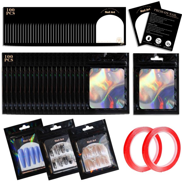 - 【Complete Set with Essentials】This press on nail packaging bag set includes 100pcs empty holographic nail packaging bags, 100pcs nail display cards, and 2pcs 3 meters of transparent double-sided tapes—everything you need to showcase press-on nails professionally.