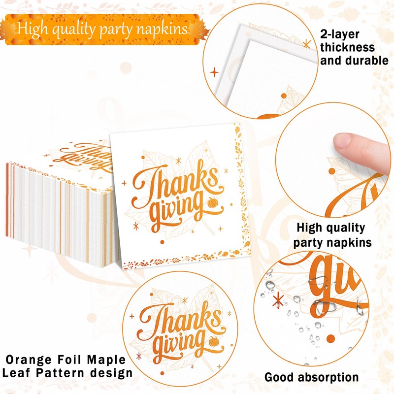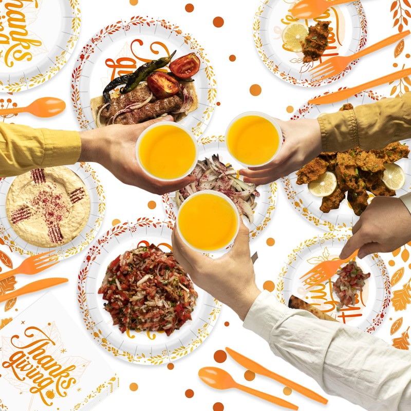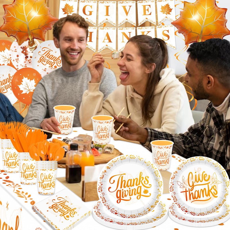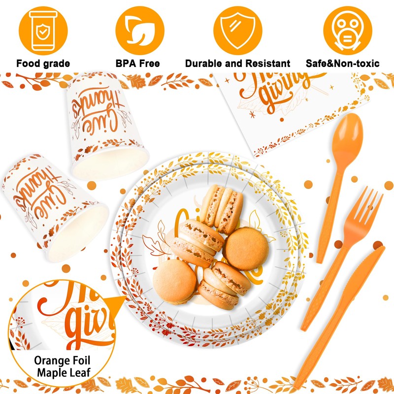 - Maple Leaf Thanksgiving Design: Maple leaf and pumpkin element are full of our orange thanksgiving decorations. Maple leaf foil balloons and banners are attractive. "Thinksgiving" charater is pringted in the center of paper plates napkins and cups. They will be a perfect fall party thanksgiving supplies. Please rest assured to use them.
