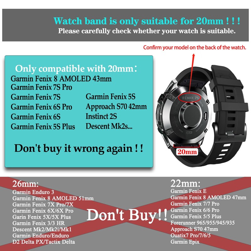 - Quickfit 20mm Silicone Strap:Compatible with Garmin Fenix 8 AMOLED-43MM/Fenix 7S/Fenix 7S Pro/Fenix 6S/Fenix 6S Pro/Fenix 5S/Fenix 5S Plus/epix Pro 42MM/Approach S70 42mm/Descent Mk3 – 43mm/Descent Mk2s
