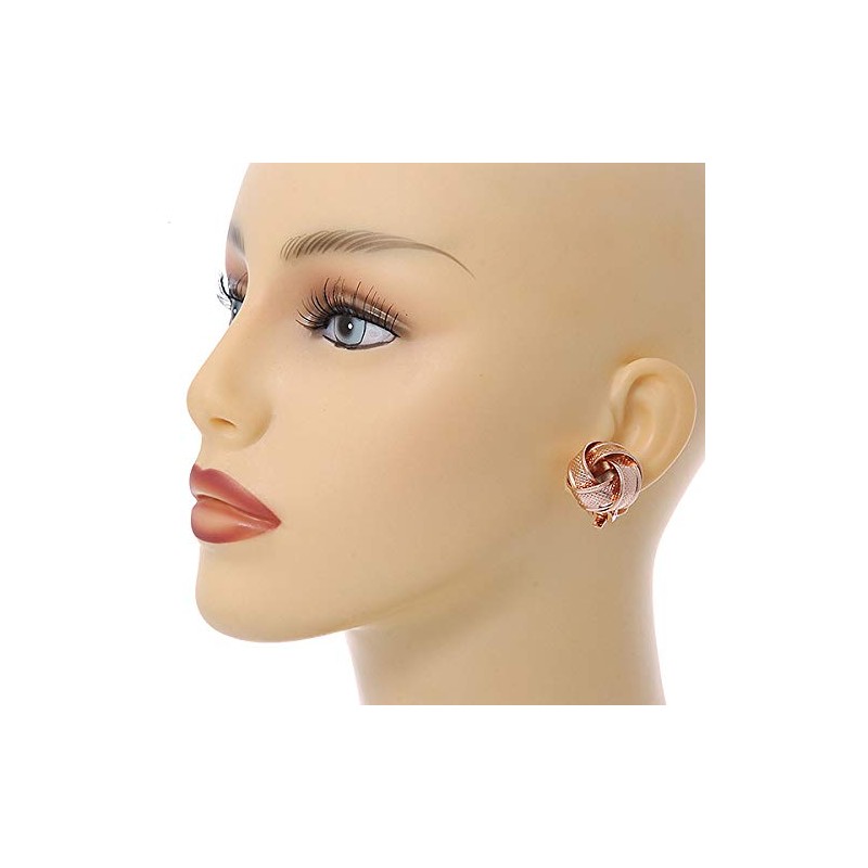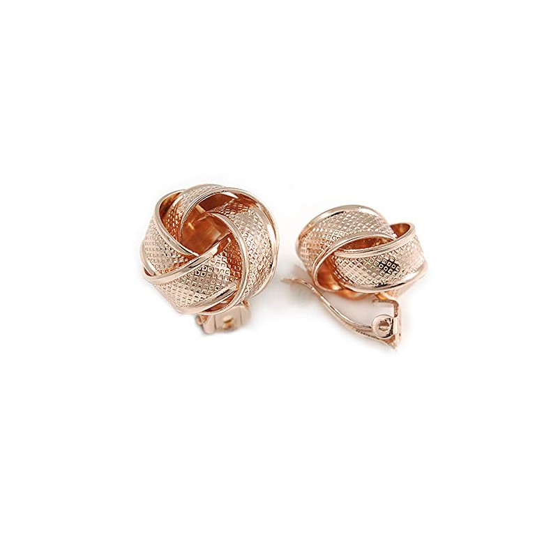 Accent day or evening wear with these Rose Gold Tone Textured Knot Clip On Earrings. Featuring a knot shape design, crafted in rose gold tone metal and decorated with textured detailing. They measure about: 20mm Diameter. Secures with a clip-on clasp to keep sensitive ears comfortable. Each earring weight is about 7g.