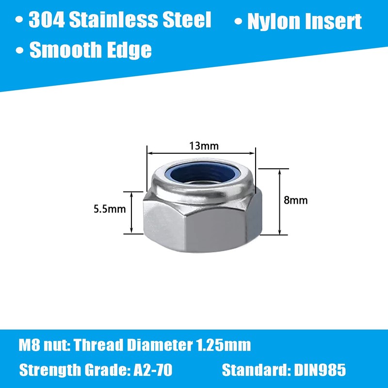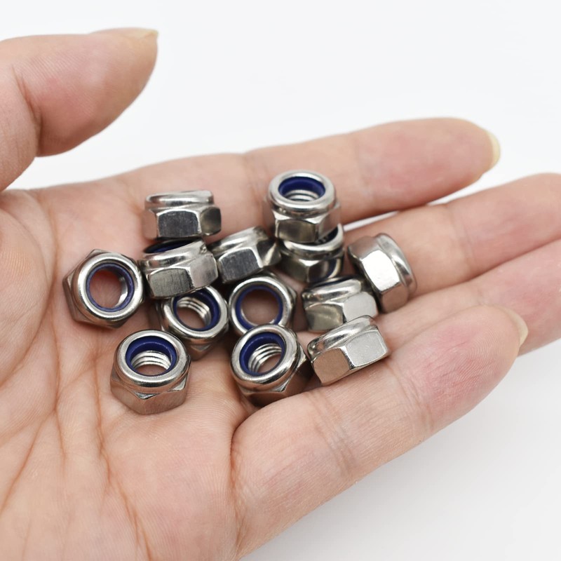 • 【High quality stainless steel】Nylon insert hexagonal lock nuts are made of 304 (18-8) stainless steel, strong and corrosion resistant, with nylon insert inside, the lock nuts greatly reduce loosening under vibration and torque.