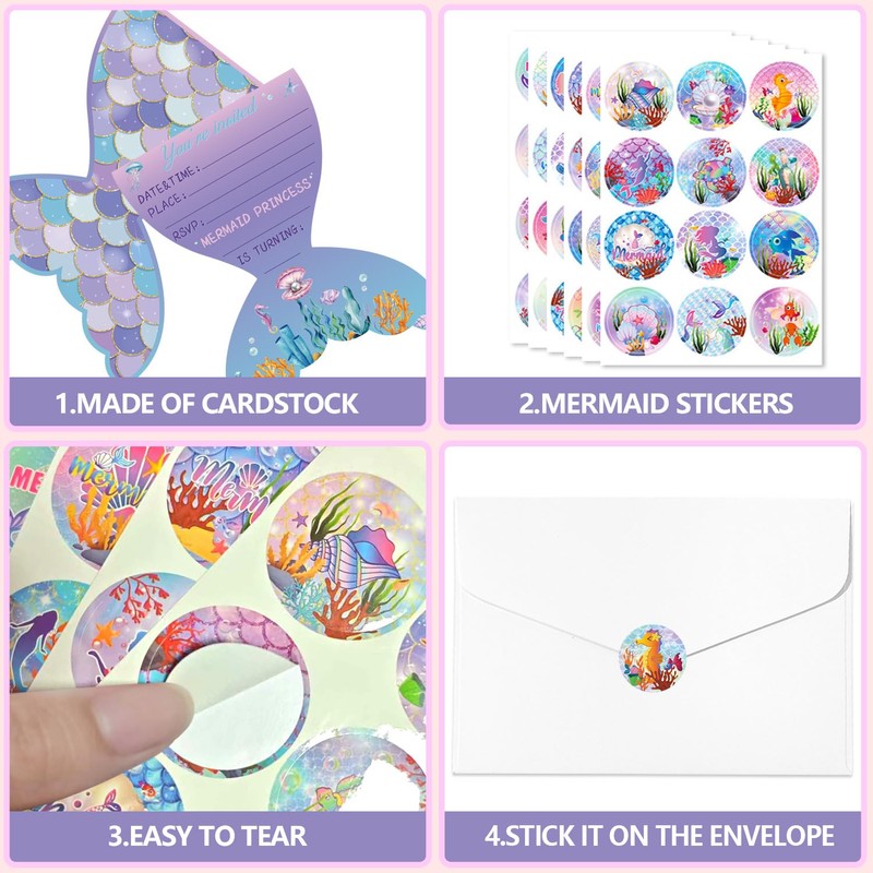 - Premium Materials: These little mermaid party invitations are made of high-quality and carefully selected cardboard. The pattern printing is clear and beautiful and can maintain its gloss for a long time. The stickers have appropriate viscosity and won't fall off easily when stuck on.