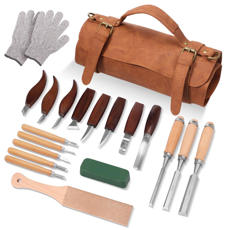 20Pcs Wood Carving Kits, Wood Carving Knife Set with PU Storage Bag, Woodworking Kit with 3Pcs Chisels & 8Pcs Whittling Knives & 5 Detail Knives for Beginners, Adults