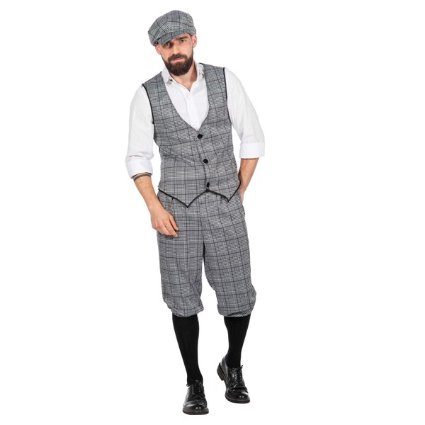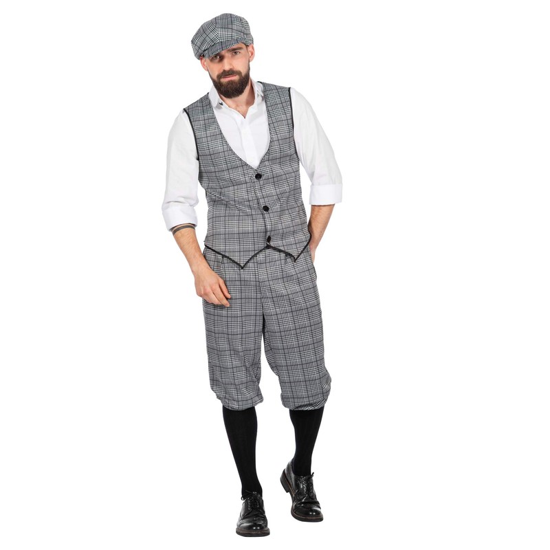 With this high-quality 3-piece men's costumein Glencheck pattern you are perfectly equipped for the next themed or carnival party. The suit consists of the typical Knickerbocker trousers, a vest and a flat cap.
