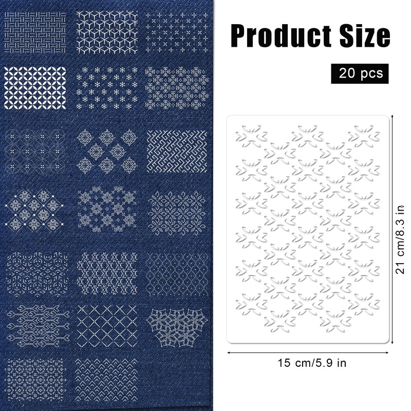 - Paketinhalt: Dieses Set enthält 20 Plastik Sashiko Vorlagen in verschiedenen Mustern. Perfekt für Handquilten, Stickereien und kreative DIY Nähprojekte. Genug, um Ihre verschiedenen Stickbedürfnisse zu erfüllen.