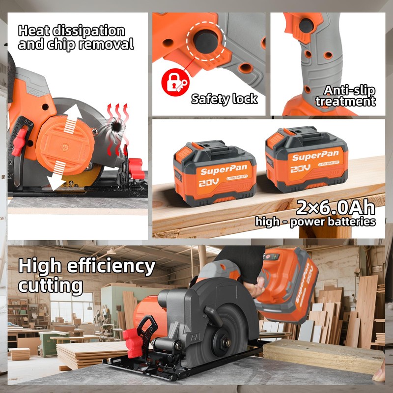 - 【circular saw & Adjustable Cutting Depth and Angle】The SUPERPAN cordless circular saw allows smooth 0° - 45° angle adjustments (1-11/16" max depth at 90°, 1-3/16" at 45°). With a quick - release system, depth and angle changes take seconds. Included 2×6.0Ah batteries let you swap to a charged battery mid-task, eliminating downtime—perfect for all-day projects like framing, tiling, or furniture assembly