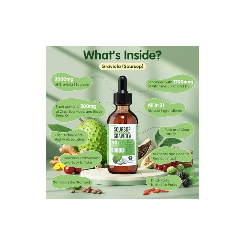 - 2000MG Soursop Graviola Liquid Drop: Graviola (Soursop) is renowned for its wide-ranging health benefits, featuring a nutrient-rich profile of vitamins (C, B1, B2) and minerals such as potassium, magnesium, and iron.