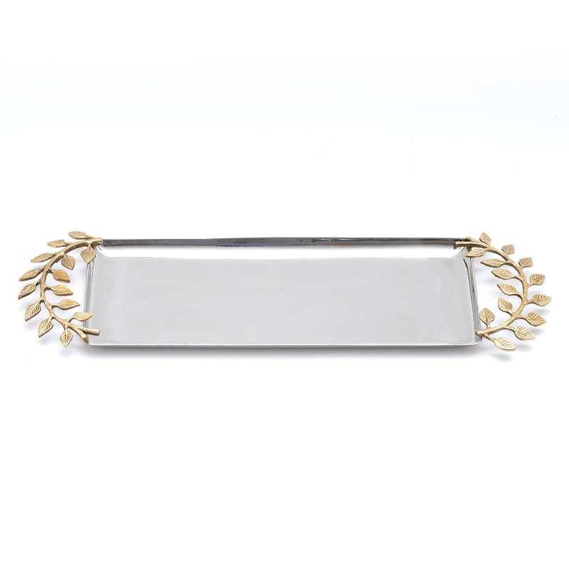 - Classic and elegant, this incredibly stylish stainless steel rectangular serving tray is a modern addition to your home. It is made of high quality material and the craftsmanship is impeccable. This hand carved tray piece would make a thoughtful gift or an excellent addition to your own collection. Showcase your favorite appetizers, salads and desserts on this elegant serving tray by Gute. This stainless steel rectangular tray is designed with a beautiful brass leaf handle detail.