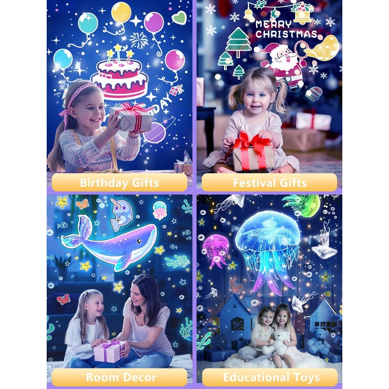 - 【21 Types of Films】21 sets of scenes: Whale, Jellyfish, Star and Moon, Unicorn, Singing Girl, Elk, Dinosaur, Aurora, Birthday, Color Planet, Fruit, Transportation, Animals, Christmas, Castle, Fireworks, Number, Panda, Monster, Big Jellyfish, Rabbit. The baby projector creates a wonderful atmosphere, and the projection films ensure that all projections are beautiful and can stimulate children's curiosity and imagination. By changing the projection film every day, the entire room transforms into a dream-like world.