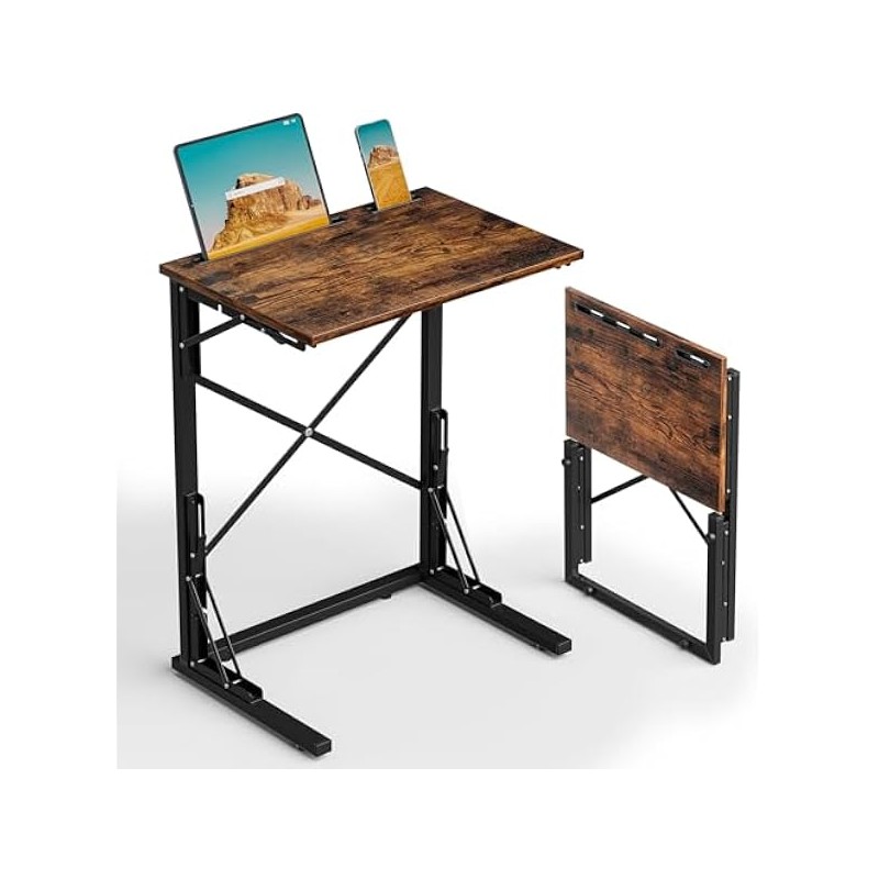 21''Wx28''H Folding TV Tray, Small Foldable C-Shaped End Table for Eating with Tablet and Phone Slots, Slide Under Couch Side Table for Recliner, Living Room, Bedroom, Rustic Brown
