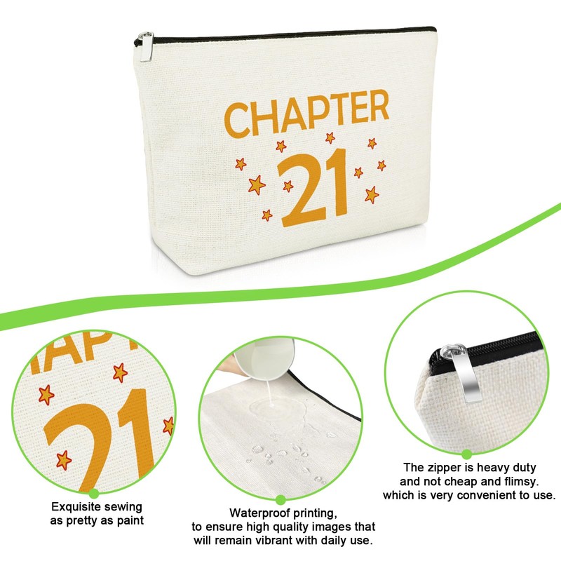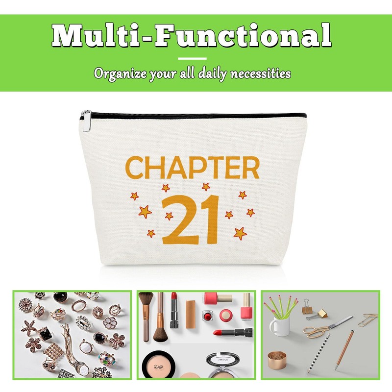 - Happy 21 Birthday Gift:This 21st birthday makeup bag for girls, printed with-"Chapter 21". 21st-A meaningful birthday makeup bag to celebrate 21 years old being awesome! Cute birthday makeup bag gift for someone who just turning 21, meaningful 21 year old party favors for women men families friends children.
