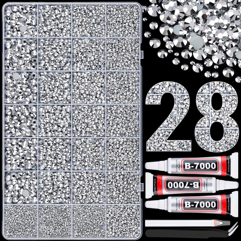 - PACKAGE CONTENT -- Include 1 box with 28 grids, featuring a variety of sizes, approx. 21000 pcs bling-out resin rhinestones (Silver). 1 tweezers and 1 pickup pen are included for easily picking up of rhinestones. 3 B7000 glue for jewelry making