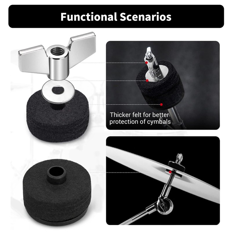 - 【 Premium Felts for Protection & Sound】Made of high-quality felt to reduce metal-on-cymbal contact, extending cymbal life. Enhances sound clarity and performance by minimizing unwanted vibrations and collisions.