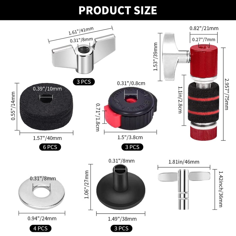 - 【 Package Included】Standard Size cymbal replacement accessories 21pcs, include 6pcs cymbal felts & 3pcs cymbal sleeves & 3pcs wing nuts & 4pcs washers & 1pcs Hi-Hat Clutch& 3pcs plastic cymbal Nuts & 1pcs drum key Compatible with most drum kits, stands, and cymbal stackers—ideal for emergencies or upgrades.