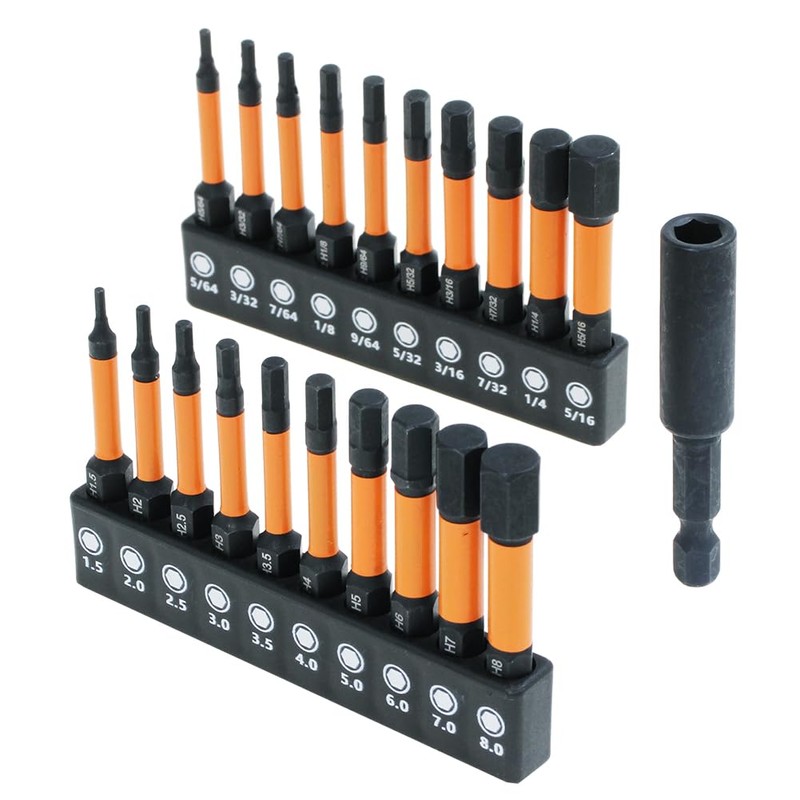 21pcs Hex Head Allen Wrench Drill Bit Set, Metric and SAE Hex Screwdriver Bits Set S2 Steel with Magnetic Extension Bit Holder