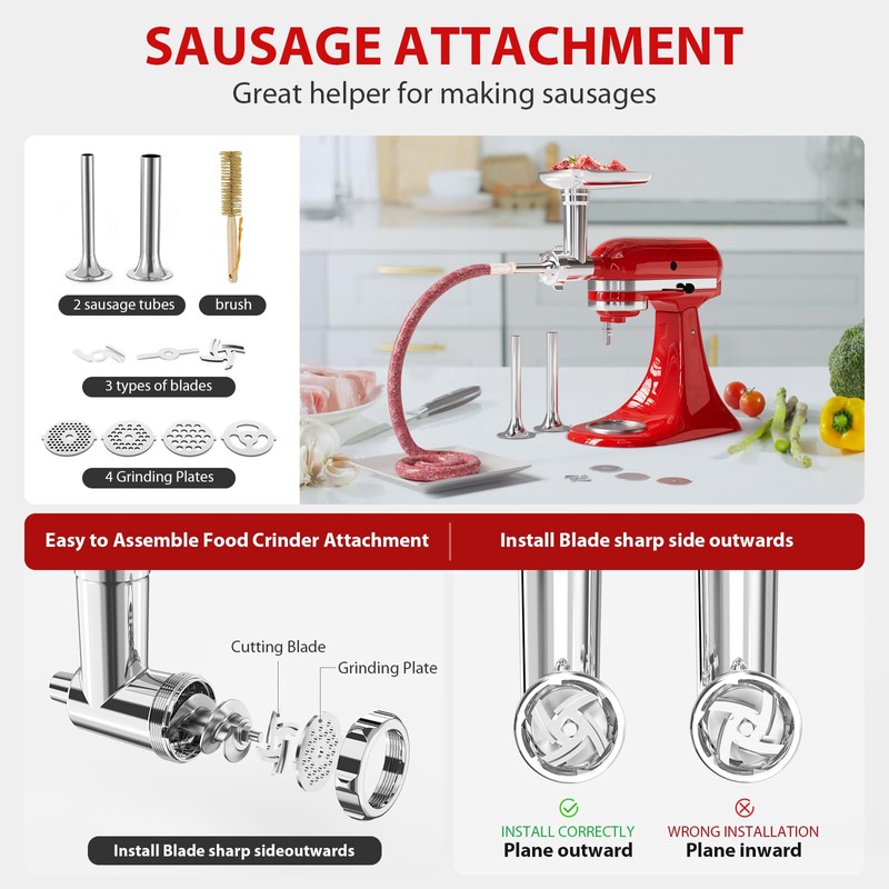 - For kitchen aid mixers accessories are designed to handle a wide range of tasks. The meat grinder for KitchenAid mixer boasts a complete set of components, including the Grinder Body Device, 4 Grinding Plates (Fine, Medium, Coarse, Kidney), 3 Cutting Blades, Sausage Stuffing Tubes (2 sizes), Food Tray, Food Pusher, and Cleaning Brush. With these kitchenaid mixer accessories, you can effortlessly grind various ingredients such as meat, fruits, vegetables, and bread crumbs.
