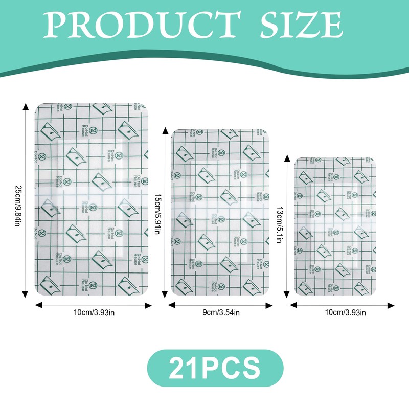 - [Package]-You will receive 21pcs waterproof wound dressing in 3 sizes, which are pu film 10*13 with cotton 6*9,pu film 9*15 with cotton 5*9,pu film 10*25 with cotton 5*20, suitable for your daily life use.