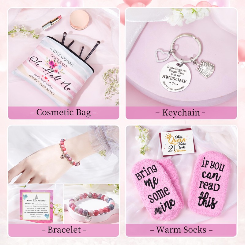 - 8PCS 21ST BIRTHDAY GIFTS SET-All of the items in this 21 year old girl birthday gift ideas are carefully designed to be fun and loving.Including 20oz insulated tumbler,lavender scented candle,cotton socks,key-chain, cosmetic bag,gifts card & gifts box.Still worried about picking out her 21 Birthday gifts? This value-for-money luxury Birthday gifts box is the most thoughtful choice you can make!