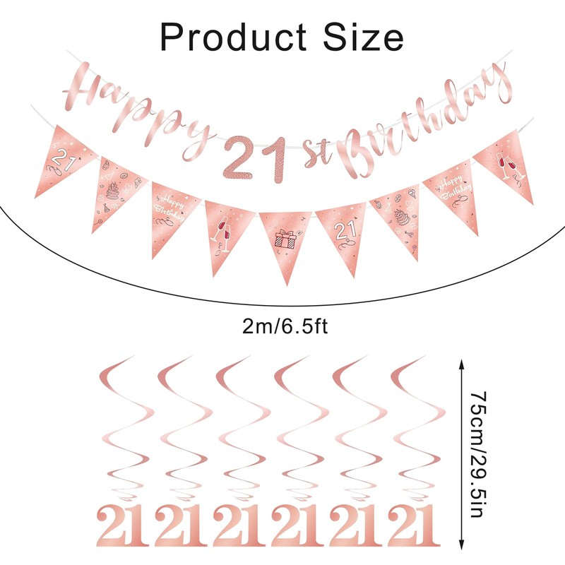 Package Includes: 1x "Happy 21st Birthday" banner (glitter lettering, 2m length); 1x triangle flag banner (rose gold foil, 2m length; 6x rose gold hanging swirls with "21" accents (30cm each).