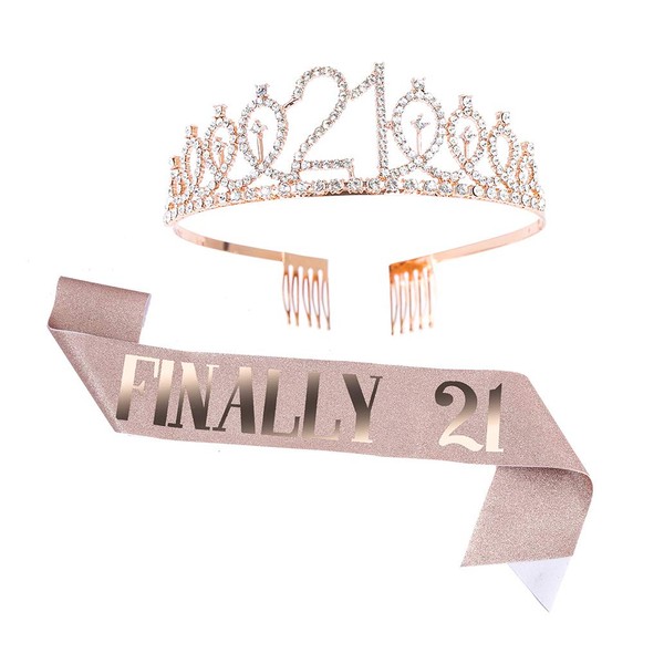 21st Birthday Tiara and Sash Set - Finally 21 Rose Gold Sash Crystal Crown for Girls 21st Birthday Party Supplies