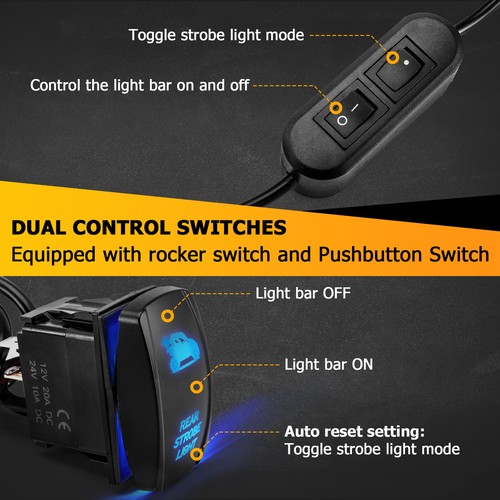 Equipped with customized rocker switch and universal button switch, they can simultaneously control the light bar open / close and light mode, when press and hold the strobe mode switch for 3 seconds ,the strobe lights will turn off.