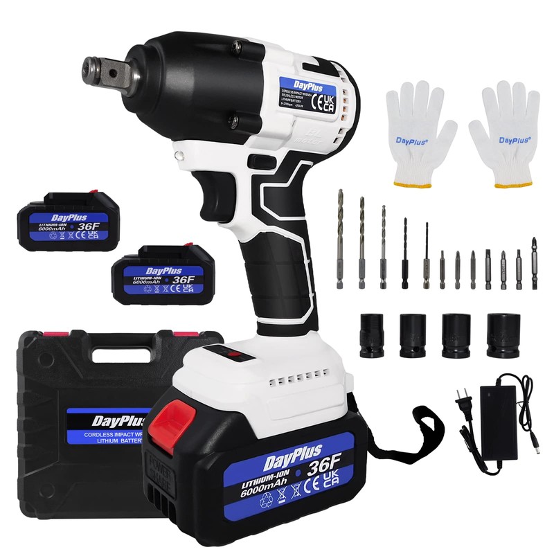 - 【What You Get】1 x Cordless Impact Wrench, 2 x 6.0Ah Li-ion Battery, 1 x Charger, 4 x Sockets(14mm/17mm/19mm/22 mm), 12 x Electric drill Accessories, 1 x Antiskid Gloves, 1 x Lubricating Oil, 1 x Carry Case, 1 x User Manual. No need to buy extra sockets, one-stop solution to your problems! We have equipped you with accessories that can meet most of your needs.