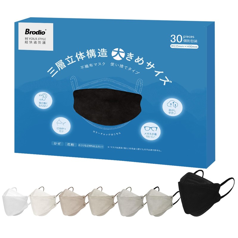 - 【安心な防護】マスクは三層高密度フィルター素材で構成され、日本国内の試験機関KAKENによるテストをクリアしています。各種の微粒子のろ過率は99%以上で、安心してお使いいただけます。高い防護性能はBrodio快適さの前提となっています。(KAKEN一般財団法人 カケンテストセンター ,日本衛生材料工業連合会・全国マスク工業会が定めた試験方法)
